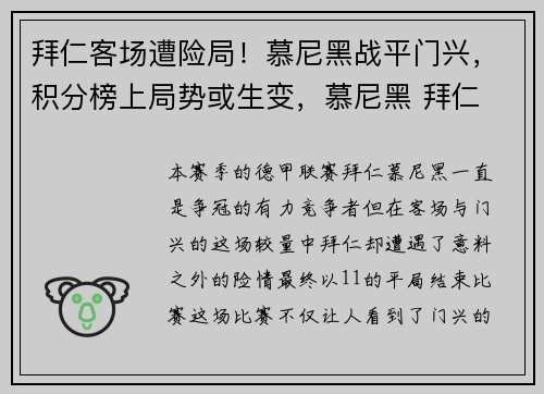 本赛季的德甲联赛,拜仁慕尼黑一直是争冠的有力竞争者,但在客场与门兴的这场较量中,拜仁却遭遇了意料之外的险情,最终以1-1的平局结束比赛。这场比赛不仅让人看到了门兴的顽强防守,也暴露了拜仁在客场应对压力时的不足,尤其是在进攻端的缺乏创造性和防守端的松懈表现。对于一直处于领先位置的拜仁而言,这场平局意味着什么?积分榜上的局势是否会因此而发生变化?