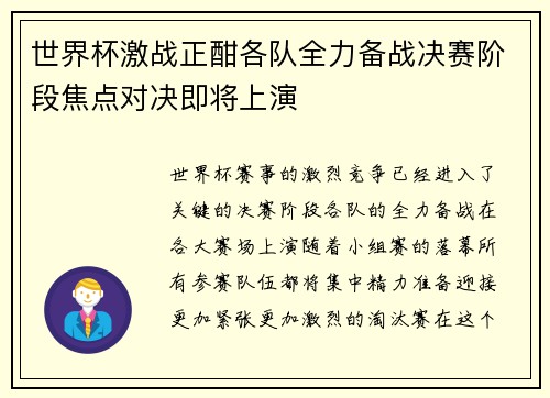 总的来说,世界杯的决赛阶段不仅是球员们身体与技术的较量,更是战术与智慧的比拼。各队的备战工作无疑是密集而高效的,每一个细节的把握都可能决定比赛的成败。随着比赛的推进,球迷们也将见证更多令人激动的瞬间,期待着各队在这一阶段的精彩表现。