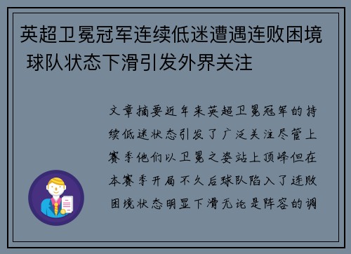 文章摘要:近年来,英超卫冕冠军的持续低迷状态引发了广泛关注。尽管上赛季他们以卫冕之姿站上顶峰,但在本赛季开局不久后,球队陷入了连败困境,状态明显下滑。无论是阵容的调整问题,球员状态的起伏,还是战术体系的困境,都成为了球队低迷的根源。而外界的质疑与分析声此起彼伏,俱乐部管理层和教练组面临巨大的压力。本文将从四个方面对这一现象进行深度剖析:一是球队阵容的变化与挑战,二是核心球员的伤病与状态问题,三是战术体系的调整与局限,四是外部压力与媒体的影响。通过这四个角度的分析,深入探讨卫冕冠军为何会陷入当前的困境,揭示其背后复杂的原因与可能的解决路径。