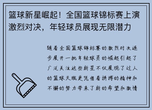 随着全国篮球锦标赛的激烈对决逐步展开,一批年轻球员的崛起引起了广泛关注。这些新星不仅展现了过人的篮球天赋,更凭借着拼搏的精神和不懈的努力,带来了新的希望和激情。比赛中,年轻球员们用自己的表现打破了传统强队的垄断格局,为整个篮球赛事注入了新的活力。这不仅是对他们个人能力的认可,更是中国篮球未来发展的缩影。本文将从四个方面详细阐述篮球新星崛起的背景、他们的潜力以及全国篮球锦标赛上激烈对决的精彩瞬间,带你深入了解这场关于年轻力量的篮球盛宴。